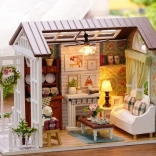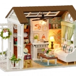 Das Set enthält alles Notwendige für den Bau des Wohnzimmers und dessen Ausstattung, einschließlich Kleber und ausführlicher bebilderter Anleitungen. Die LED-Beleuchtung, die im Paket enthalten ist, wird mit Batterien betrieben (2× AAA 1,5 V und 3× 1,5 V LR54 – Batterien nicht enthalten) und rundet die Gesamtatmosphäre wunderschön ab.