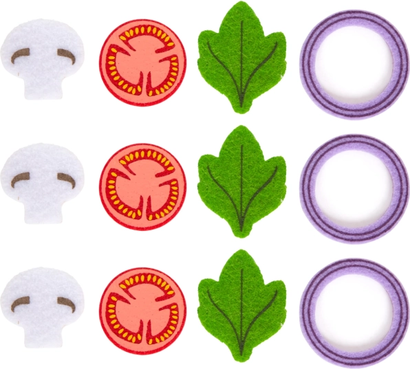 Das Set enthält 12 Filz-Imitate von Zutaten wie Pilze, Tomaten und Zwiebeln, die Kindern die Möglichkeit bieten, vielfältige Gerichte zu kreieren.
