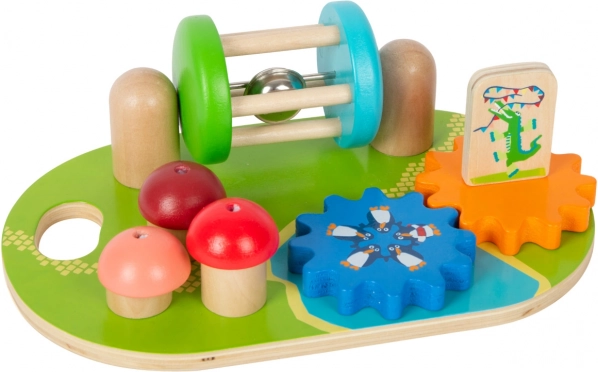 Die Holzplatte bietet verschiedene bewegliche Elemente wie Zahnräder und Schwämme zur Förderung der Feinmotorik.
