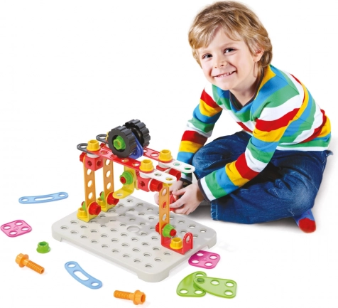 Schrauben, Muttern und Lochplatten lassen sich leicht verbinden und halten sicher. Kinder bauen Autos, Traktoren, Kräne und eigene Modelle – einfach und sicher.