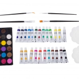 Palette mit 24 Aquarellfarben, 24 Farben in Tuben, Pinsel und zwei Kunststoffpaletten – eine komplette Ausstattung für Wasserfarben und deckende Techniken.