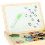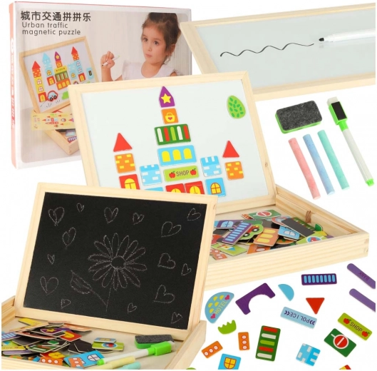 Die beidseitige 2-in-1-Lerntafel aus naturbelassenem Holz bietet eine weiße magnetische Seite zum Legen magnetischer Puzzles und zum Schreiben mit Marker sowie eine schwarze Kreideseite für klassisches Zeichnen. Enthalten sind ca. 100 Magnete mit Stadtmotiv, bunte Kreiden, ein abwischbarer Marker mit Filz und ein Schwämmchen – ideal zur Förderung der Kreativität und der Feinmotorik.