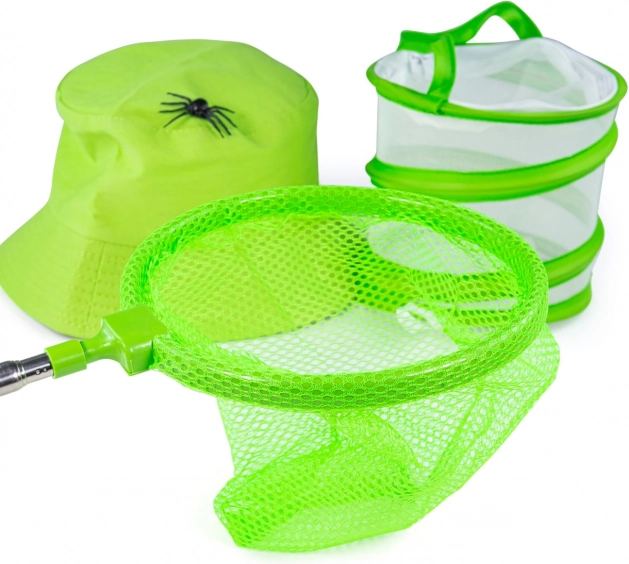 Netz, Sammeldose, Lupe, Fangpinzette, Fernglas und Sonnenhut – die komplette Ausrüstung für sicheres Fangen und Beobachten von Insekten und mehr in der Natur.