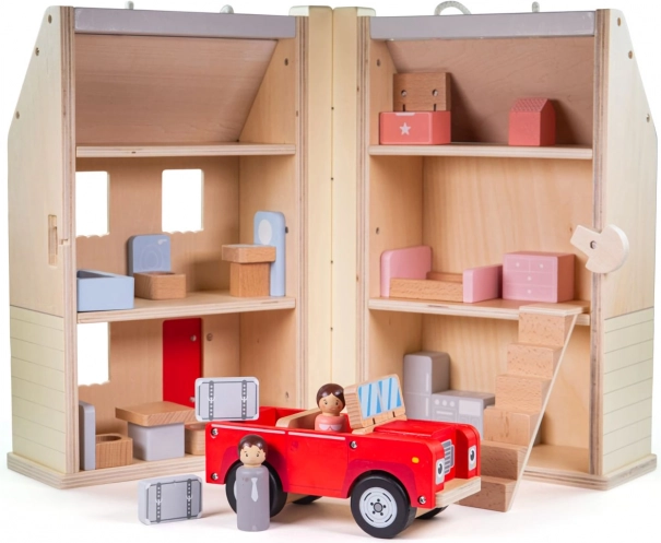 • Komplettset: 3 Etagen, 13 Möbelteile, 2 Figuren und Holzauto