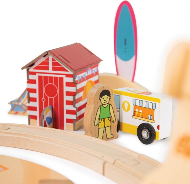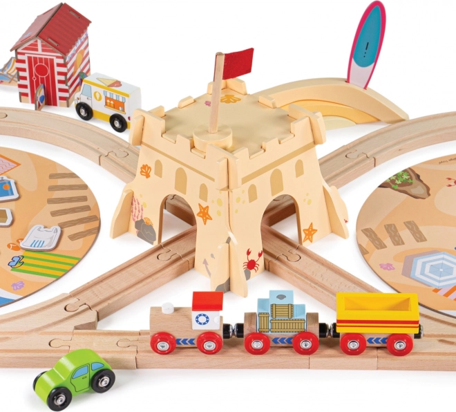 Diese Küsten-Eisenbahn bietet viel einfallsreichen Spielspaß und Lernen in einem. Kinder fahren auf der Strecke, passieren die große Sandburg, kommen an bunten Strandhäuschen vorbei und lernen dabei dank praktischer magnetischer Klapptafeln das Mülltrennen. Alles in hochwertiger Ausführung aus verantwortungsvoll gewonnenen Materialien mit unbedenklichen Farben und Lacken.