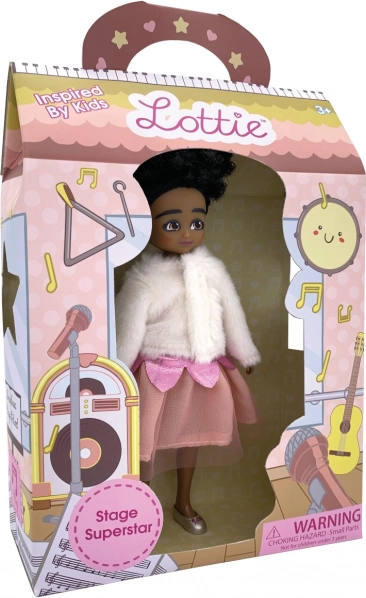 Lottie Puppe Bühnen-Superstar trägt ein elegantes Kostüm bereit für die Bühne. Ihre schwarzen gewellten Haare mit rosa Schleife und die beiliegenden Accessoires machen sie zu einem unwiderstehlichen Star der kindlichen Vorstellungskraft.