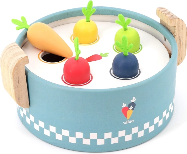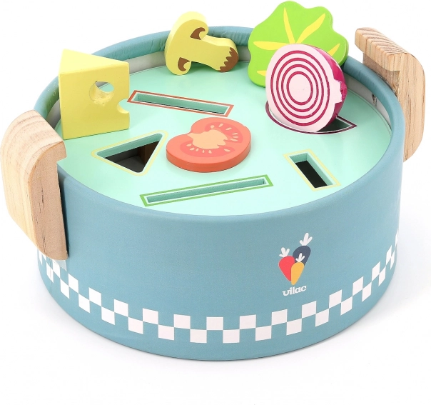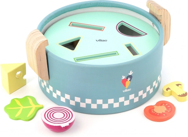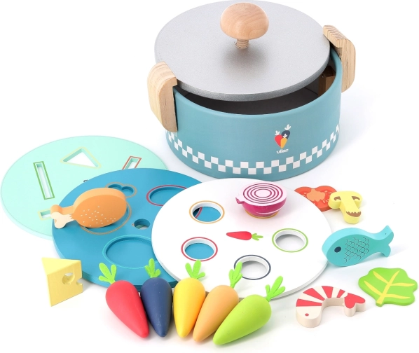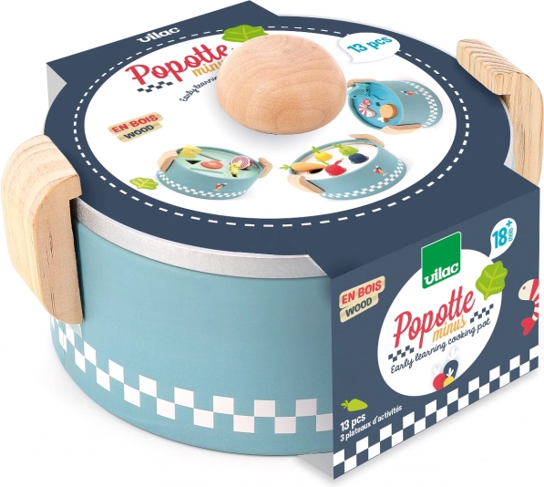 Der VILAC Einlege-Mini-Topf ist ein cleveres Holzspielzeug für die Kleinsten ab 18 Monaten. Unter dem Deckel verbergen sich drei austauschbare Platten mit verschiedenen Formen, in die Kinder bunte Lebensmittelstücke einlegen oder einwerfen. So entsteht ein „Kochen“ wie in echt, das Fantasie und praktische Fähigkeiten fördert.
