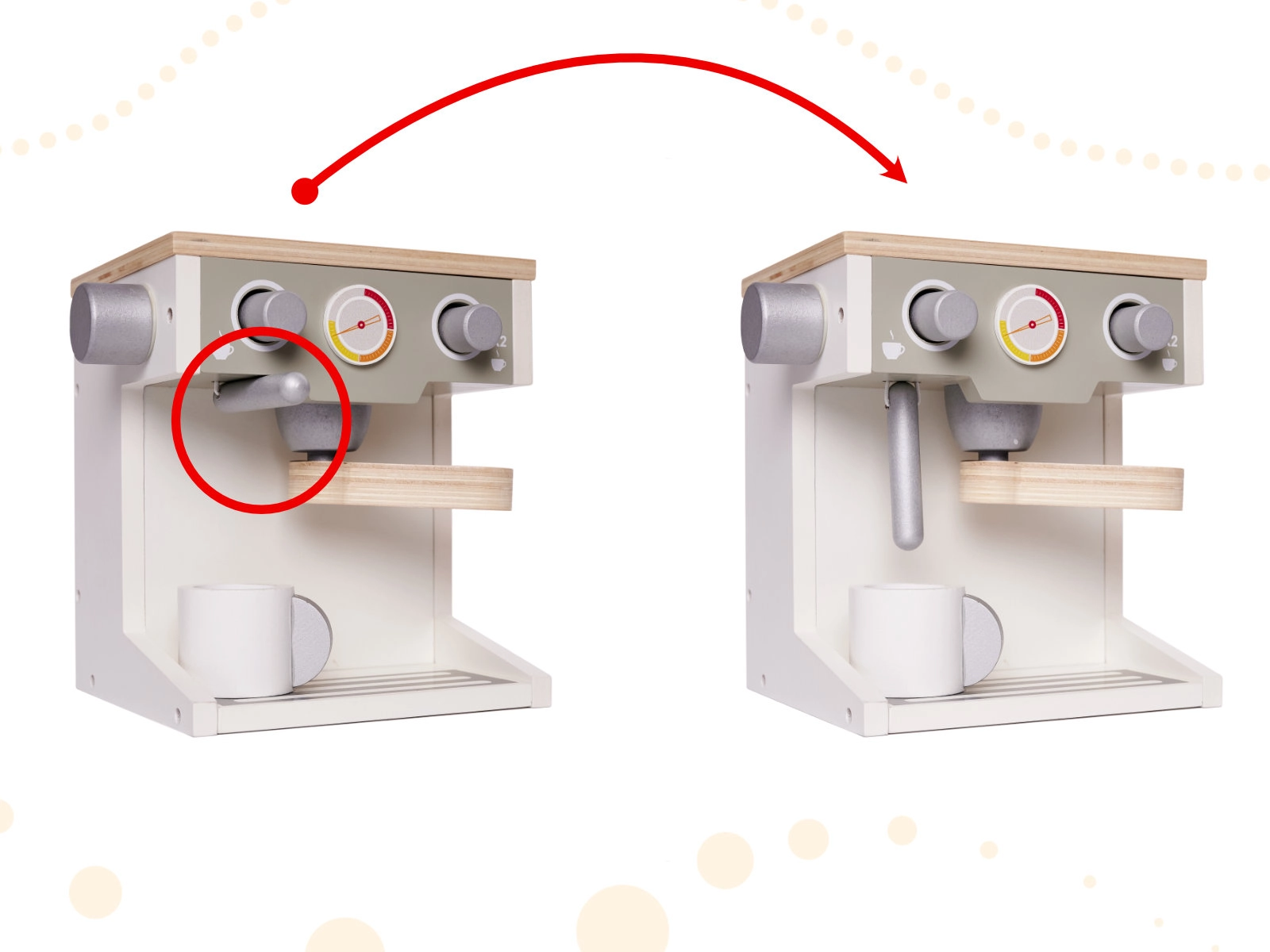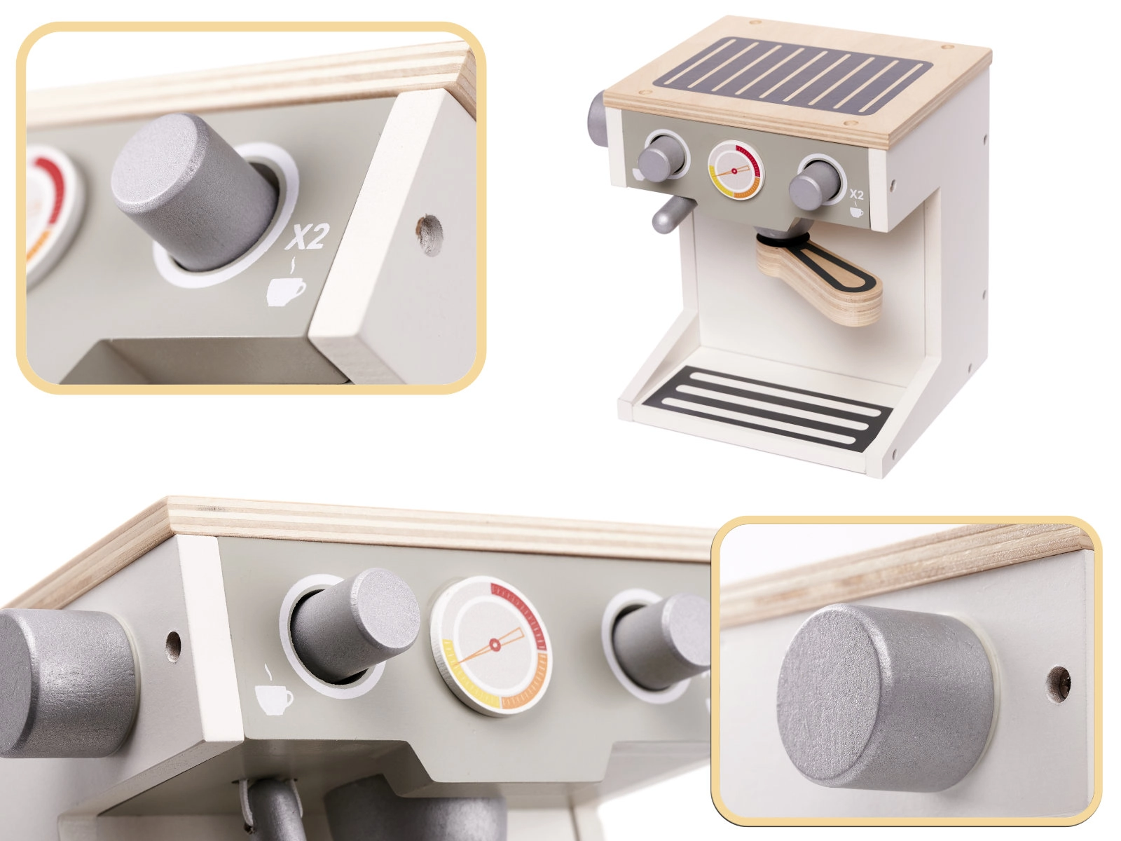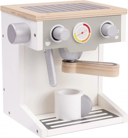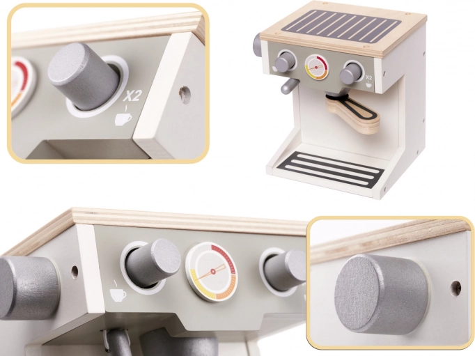 Die Holz-Kaffeemaschine bietet realistische Details und Funktionen, einschließlich Wählscheiben und eines Portafilters, die die Interaktivität und den Spielspaß erhöhen.