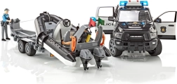 Polizei-Pick-up, Anhänger, Boot mit Zubehör, 2 Figuren (Polizistin und Taucher)