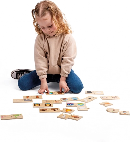Kinder verbinden Bilder, die als Gegenteile zusammengehören – zum Beispiel Tag und Nacht, warm und kalt, traurig und fröhlich. Die glatten, robusten Teile lassen sich leicht halten und anlegen, sodass kleine Hände sich auf das Entdecken neuer Wörter und Zusammenhänge konzentrieren können.