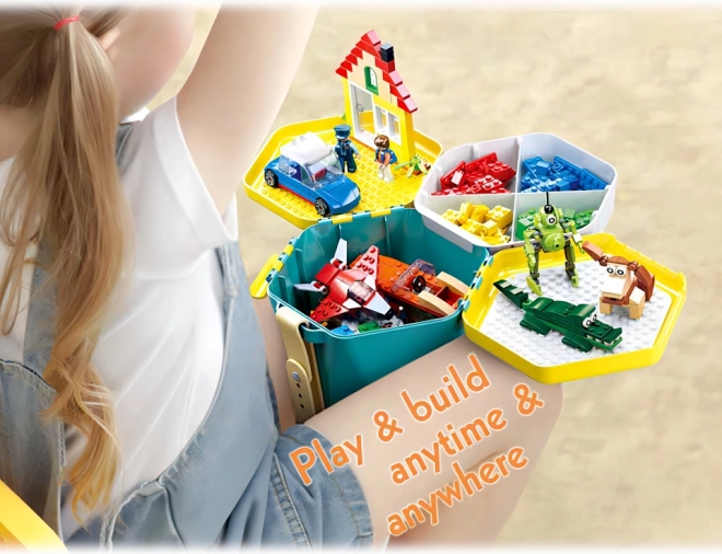 • Praktischer Eimer – der Deckel dient als Bauplatte und innen gibt es ein Fach für übersichtliches Sortieren der Teile.