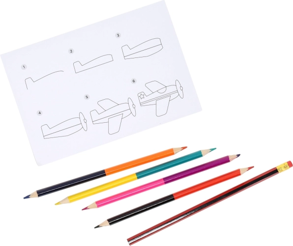 Das Metalletui mit Reißverschluss enthält Anleitung, Zeichentafel, 4 doppelseitige Buntstifte und einen Bleistift mit Radiergummi. Ideal für unterwegs.