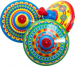 Jeder Kreisel besticht durch bunte, geometrische Muster, die Blicke anziehen und Kinder unterhalten.