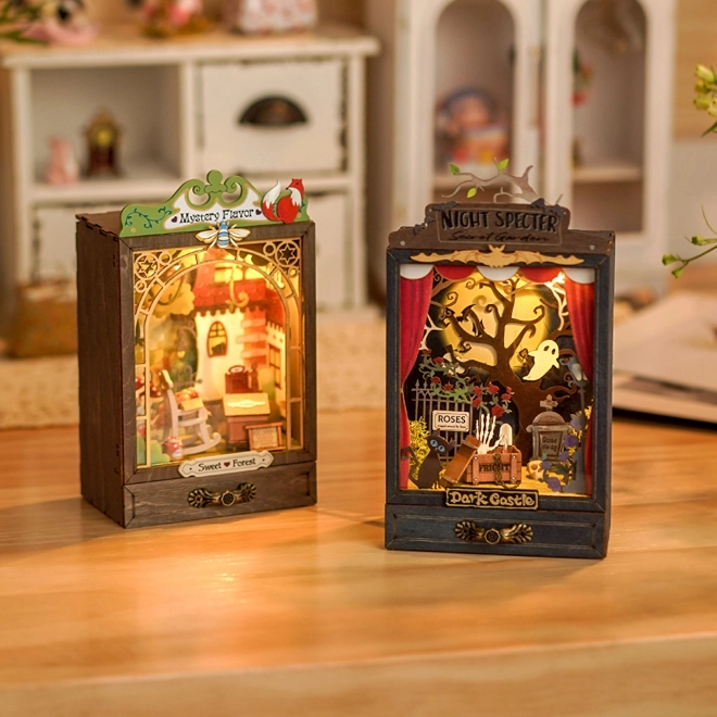 Bereiten Sie Ihre Bühne vor und führen Sie magische Vorstellungen im Schrank-Diorama auf. Dieses Miniaturtheater verfügt über eine wärmende LED-Beleuchtung, die die Tiefe und Atmosphäre Ihrer Szene hervorhebt. Versteckte Schiebepaneele aus klarem Kunststoff schützen Ihre Dekorationen vor Staub.