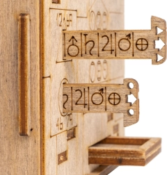 Mechanische Komponenten wie Schieber und drehende Mechanismen tragen zur Interaktivität des Rätsels bei und fördern so logisches Denken und Problemlösungen.
