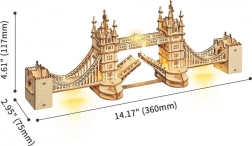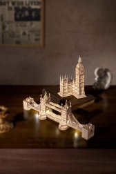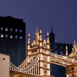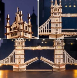 Entdecken Sie die Atmosphäre Londons mit einem realistischen Tower-Bridge-Modell aus hochwertigem Sperrholz. Die Teile greifen präzise ineinander, wodurch der Aufbau flüssig und unterhaltsam ist. Die integrierte LED-Beleuchtung verleiht dem fertigen Bau abends eine gemütliche Note und hebt die durchdachten architektonischen Details hervor.
