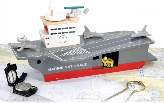 Starkes und dennoch leichtes Sperrholz, eine stabile Konstruktion und bemalte Details in den Farben der Marine Nationale sorgen für langanhaltenden Spielspaß und eine attraktive Optik.