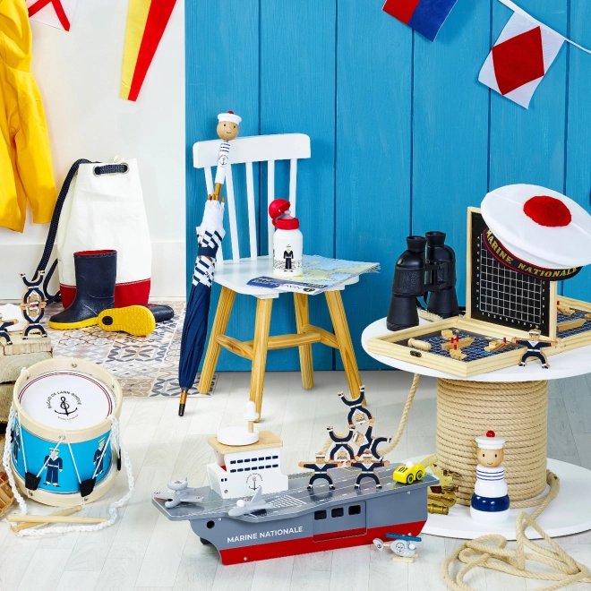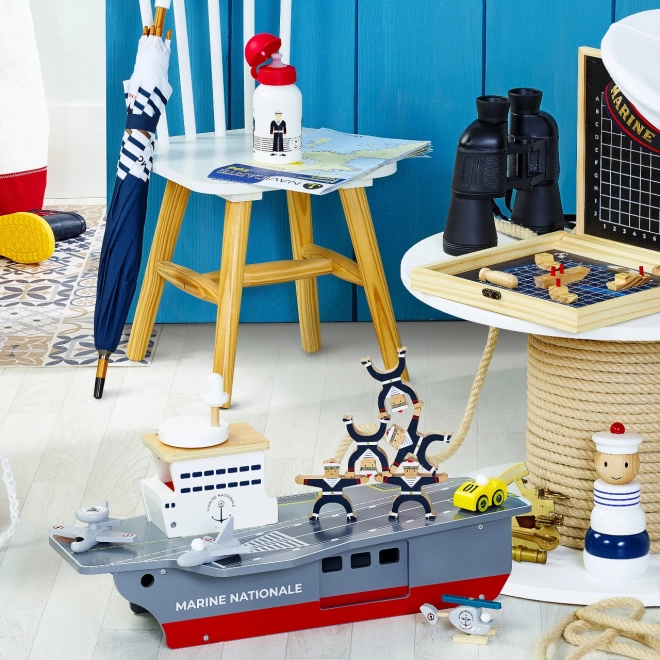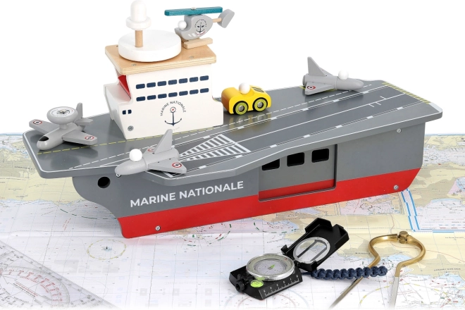 Auf in die weite See mit dem hölzernen Flugzeugträger von Vilac, entwickelt in Zusammenarbeit mit der französischen Marine. Er bietet einen funktionierenden Aufzug, ein großzügiges Unterdeck und 5 Zubehörteile im Design der Marine Nationale für stundenlanges kreatives Spiel.