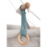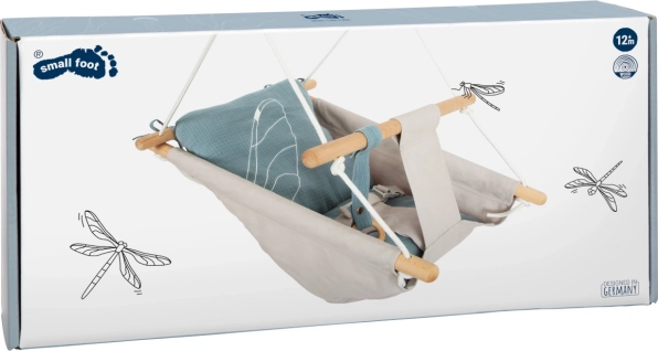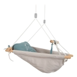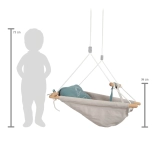 Der Stoff der Liegefläche passt sich optimal der Körperform des Kindes an und ist leicht zu pflegen. Die Holzkonstruktion besteht aus hochwertigen, natürlichen Materialien, die Umweltfreundlichkeit und Sicherheit betonen. Die Tragfähigkeit der Schaukel beträgt bis zu 30 kg, was eine lang anhaltende Nutzung gewährleistet.