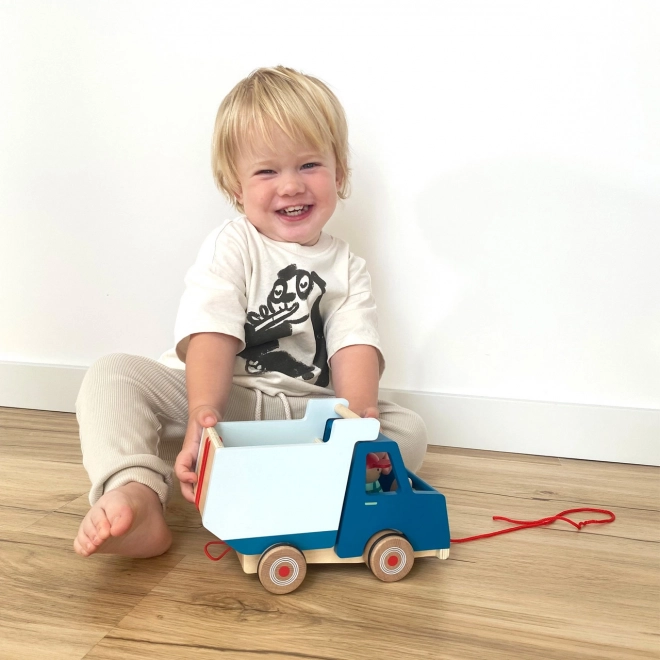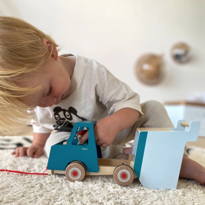 Auf der Rückseite des Kippers befindet sich eine Schlaufe, die das Anschließen weiterer Fahrzeuge ermöglicht und so das Training der Feinmotorik unterstützt. Das Produkt hat ein modernes Design mit kräftigen Kontrastfarben und ist aus natürlichem Holz gefertigt, was seine Langlebigkeit gewährleistet.