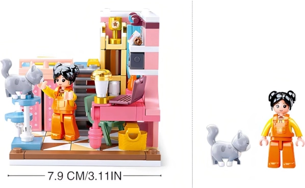 Bauen Sie ein detailreiches Mini-Schlafzimmer aus der beliebten Serie Sluban Girls Dream. Aus 210 Teilen entsteht eine originelle Szene mit Zubehör und 2 Figuren mit dreh- und schwenkbaren Teilen. Dank der Kompatibilität mit LEGO, Cobi und Mega Bloks erweitern Sie Ihre Bausteinwelt ganz einfach.