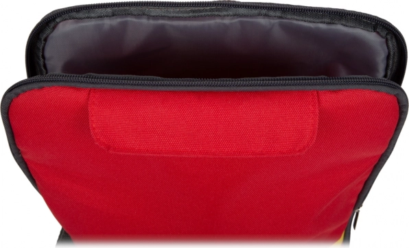 Der Rucksack in Rot-Gelb verfügt über einen Doppelreißverschluss für schnelles Öffnen, verstellbare Schulterträger für bequemes Tragen und zwei Schnallen zum Befestigen von Zubehör. Holz- und Kunststoffteile liegen gut in der Hand und halten intensivem Spielen stand.