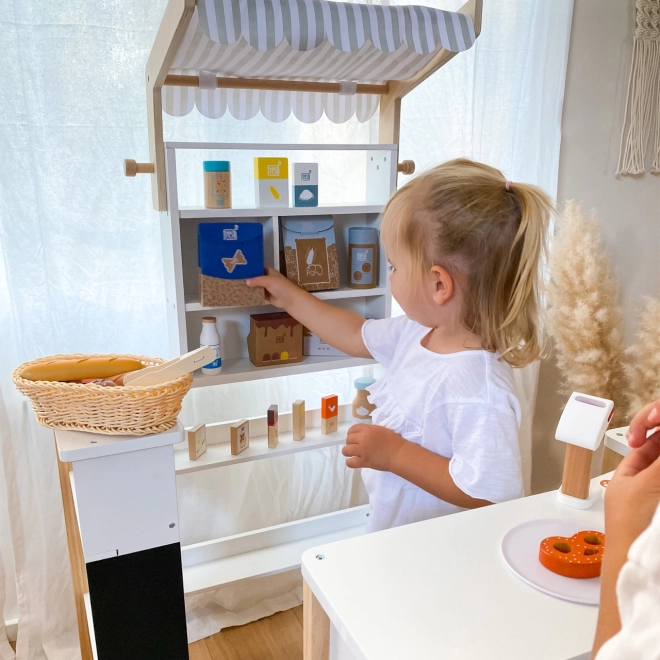 Stilvoller Kinder-Verkaufsstand aus Holz im skandinavischen Design für kreatives Kaufladen-Spiel. Bietet eine modulare Konstruktion, eine abnehmbare Stoffmarkise, eine beschreibbare Tafel und sichere, abgerundete Kanten. Passt dank der Kombination aus Weiß und Naturholz hervorragend in jedes Interieur und fördert die kommunikativen und sozialen Fähigkeiten der Kinder.