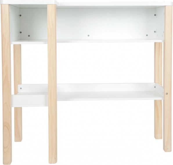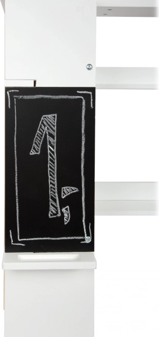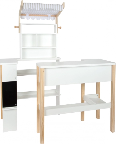 Der Holz-Verkaufsstand SMALL FOOT Fresh verwandelt das Kinderzimmer in einen kleinen Markt. Das minimalistische Erscheinungsbild in Weiß und Naturholz fügt sich in jedes Interieur ein, die abnehmbare, gestreifte Markise verleiht eine authentische Ladenoptik. Die beschreibbare Tafel mit Kreideablage lädt zum Gestalten von Beschriftungen und Preisschildern ein.