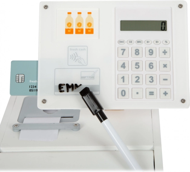 Die Holzkasse SMALL FOOT Fresh verwandelt jede Kinderecke in einen kleinen Supermarkt. Dank des integrierten Taschenrechners im drehbaren Monitor können Kinder den Einkauf leicht berechnen, die große Schublade mit Münzfächern öffnen und eine bargeldlose Zahlung mit eigener Karte und Unterschrift auf Plexiglas ausprobieren.