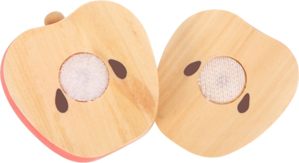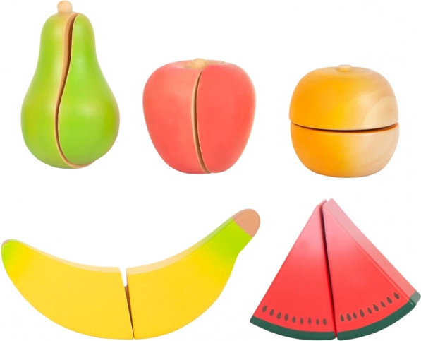 Bunte Holzteile (Apfel, Birne, Banane, Orange, Melone) lassen sich dank Klettverschluss leicht trennen und wieder verbinden – ideal zum Üben der richtigen Schneidtechnik.