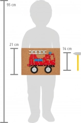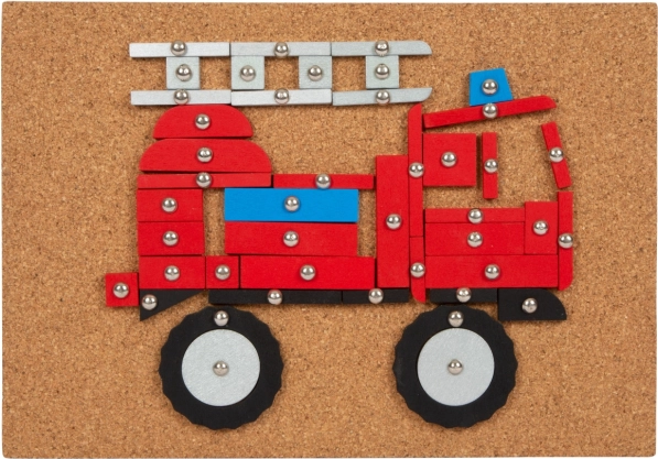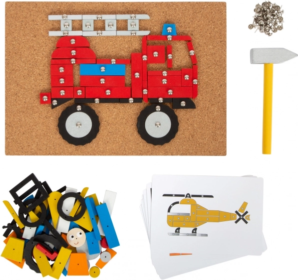 Umfangreiches kreatives Spielset mit Verkehrsthema, das eine Korkunterlage, einen Holzhammer und viele hölzerne Teile in verschiedenen Formen und Farben enthält. Hilft, Kreativität, Geschicklichkeit und Hand-Auge-Koordination zu entwickeln.