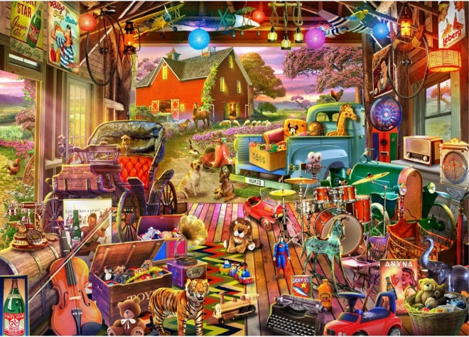 Das Premium-Puzzle von Brain Tree zeigt eine lebendige, detailreiche Szene voller Spielzeuge, Musikinstrumente und ländlicher Scheunenatmosphäre. Die matte Oberfläche verhindert Spiegelungen und lässt selbst feinste, mehrstufige Reliefdetails hervorstechen – ideal bei jedem Licht.