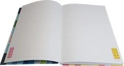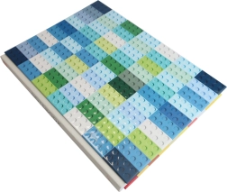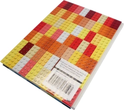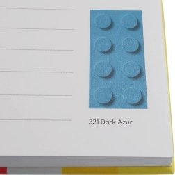 Jede linierte Seite enthält eine Illustration eines Steins in einem bestimmten LEGO-Farbton, die das Schreiben angenehmer macht und die Kreativität fördert.