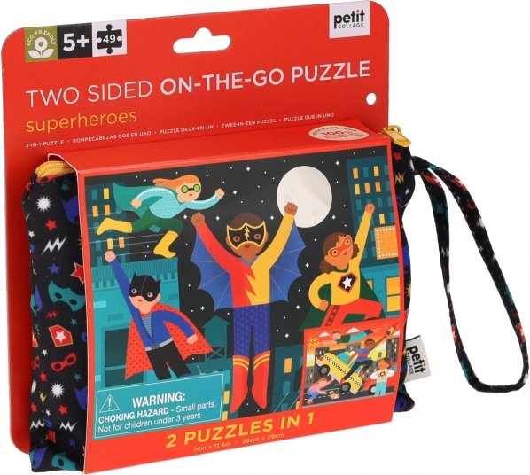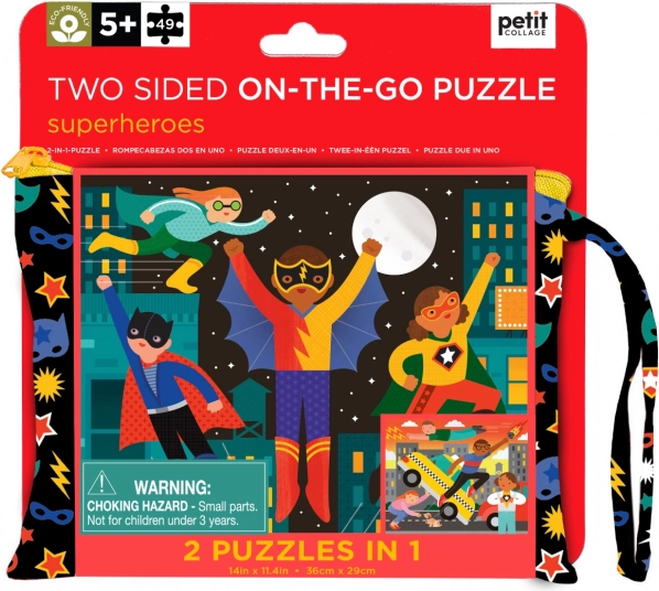 Entdecken Sie die Magie der Superheldenwelt mit dem beidseitigen Puzzle der Marke Petit Collage. Jedes Kind kann in ein Abenteuer eintauchen, das die Form- und Farberkennung fördert.