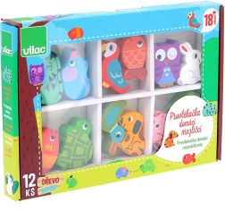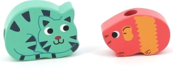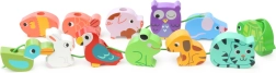 Die Perlen zeigen verschiedene Tierformen wie Frosch, Schweinchen oder Fisch, die Kinder zum Spielen einladen.