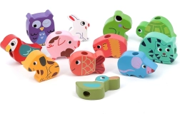 Das Fädelspiel fördert Kreativität und Feinmotorik, wenn Kinder die Tierperlen auf die Schnur fädeln.