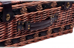 Der Korb enthält alles Notwendige für ein Picknick mit Familie oder Freunden: Teller, Besteck, Weingläser, Messer, Pfefferstreuer, Salzstreuer und Servietten.