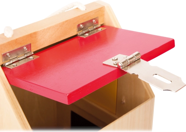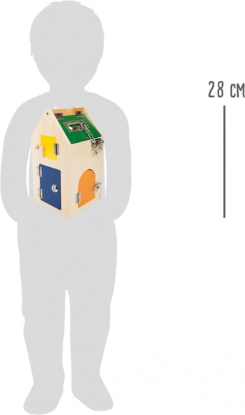 Das Häuschen besteht aus hochwertigem Holz in Kombination mit stabilen Metallteilen und hält auch intensiver Nutzung stand. Dank der kompakten Abmessungen und des praktischen Griffs ist es leicht zu transportieren – ideal für unterwegs, den Kindergarten oder das Kinderzimmer. Farbige Elemente laden zum Entdecken ein und unterstützen das Erkennen von Farben.