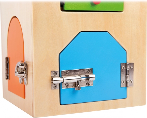 Das Motorik-Haus mit Schlössern von small foot ist ein smartes didaktisches Spielzeug, das Kindern ab 3 Jahren ermöglicht, die Welt der Verschlüsse und mechanischen Elemente sicher zu erkunden. Jede Tür verbirgt eine andere Herausforderung – vom U-Schloss und Zylinderschloss über verschiedene Schrauben und Hebel bis hin zu Scharnieren und einer Sicherheitskette. So werden Auge-Hand-Koordination, Geduld und Konzentration auf natürliche Weise gefördert.