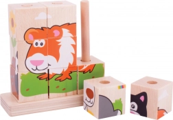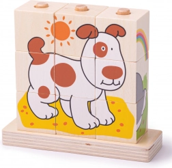 Das Set enthält insgesamt 10 Teile – 9 Würfel, die 4 verschiedene Bilder ergeben, sowie eine Holzbasis mit Stäben für sicheres und übersichtliches Stapeln. Das Spielzeug ist aus strapazierfähigem Holz mit glatter Oberfläche gefertigt und erfüllt die aktuellen europäischen Sicherheitsnormen.
