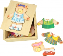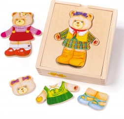 Das Anziehpuzzle Bärin von BIGJIGS TOYS beschäftigt Kinder mit dem Zusammensetzen von Gesichtern mit verschiedenen Ausdrücken und farbenfrohen Outfits. Die Tafel dient als Unterlage und zugleich als Deckel der Box, sodass die Teile leicht verstaut werden können und das Puzzle auch auf Reisen ideal ist.