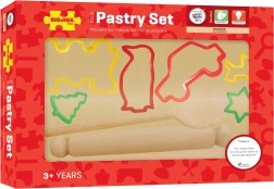 Im Set finden Sie alles für spielerische Backrunden: hölzerner Teigroller, Brettchen, Kochlöffel, Teigschaber und 6 Ausstechformen in attraktiven Motiven. Das Set ist ideal für Rollenspiel, fördert die Kreativität, unterstützt die Selbstständigkeit und motiviert Kinder, in der Küche mitzuhelfen. Die Maße des Sets betragen 24 × 18 × 3,5 cm – eine ideale Größe für die Kinderecke wie auch die heimische Küche.