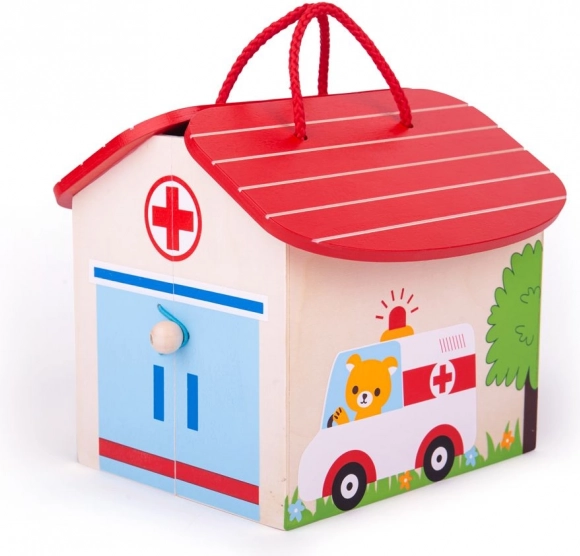 Das Set umfasst ein Krankenhausbett, eine Infusion, einen Herzmonitor sowie Figuren eines Bären, einer Krankenschwester und eines Arztes. Der Tragegriff und der sichere Verschluss sorgen dafür, dass alle Teile gut verstaut sind und das Spielset jederzeit reisefertig ist.