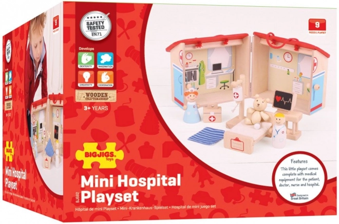 Komplette Ausstattung für das Arztspiel: Krankenhausbett, Bär, Krankenschwester, Arzt und weitere wichtige Accessoires.