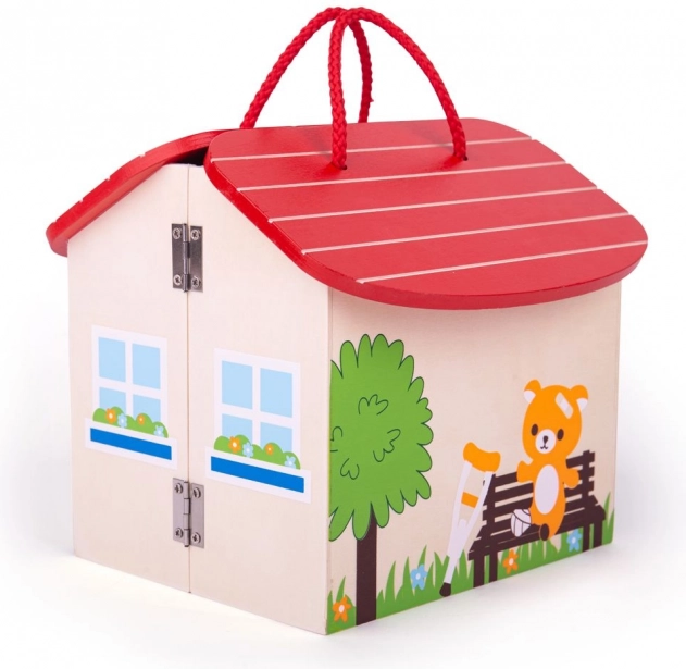 Das hausförmige Set mit Tragegriff ist ideal zum Transportieren und zur sicheren Aufbewahrung aller Spielteile.