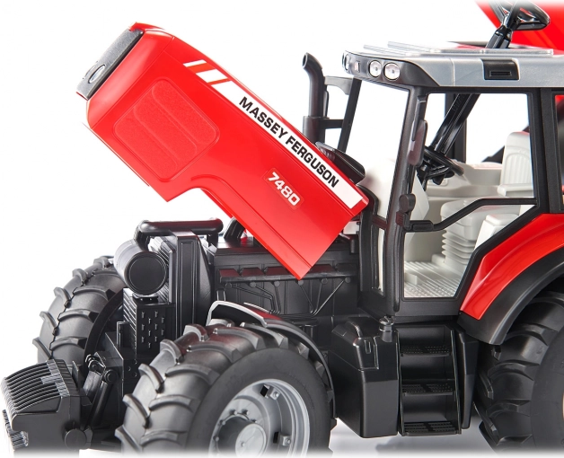 Erleben Sie realitätsnahes Bauernhof-Spiel mit dem MASSEY FERGUSON 7480 Traktor und Kippanhänger. Das Modell im Maßstab 1:16 überzeugt durch präzise Verarbeitung, eine über das Kabinendach bedienbare Funktionslenkung mit verlängerter Lenksäule und öffnende Elemente, die den Blick unter die Haube und in die Kabine erlauben.