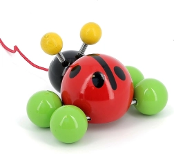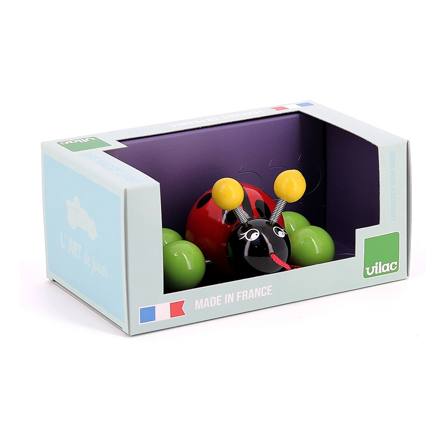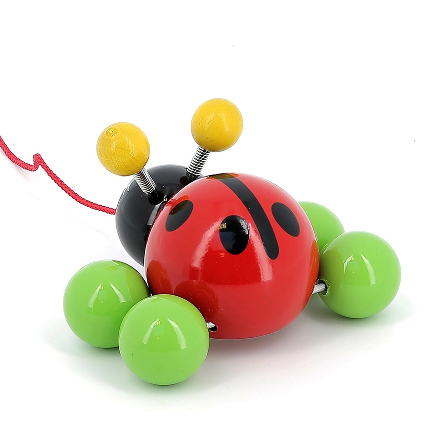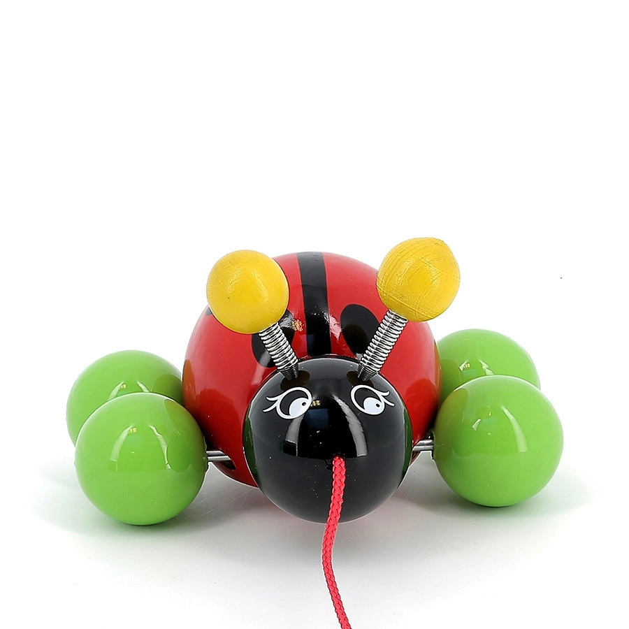 Dieser klassische Zieh-Marienkäfer aus lackiertem Holz begeistert mit seinem farbenfrohen Design, der glatten Oberfläche und den elastischen Fühlern, die beim Ziehen fröhlich wippen. Dank der runden Räder ist die Fahrt sanft, und Kinder trainieren auf natürliche Weise die Koordination ihrer Schritte sowie Sicherheit beim Gehen.