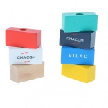 Die farbigen Holzcontainer lassen sich leicht aufsetzen und umordnen – spielerisch lernen Kinder Sortieren, logisches Denken und Bewegungskoordination.