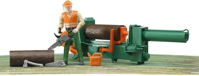 Arbeiterfigur, reflektierende Weste, Helm mit Visier, 2× Holzscheit, Axt, Handsäge, Motorsäge, Benzinkanister, Holzspalter