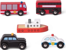 Erweitern Sie Ihr Stadtgebiet an den Gleisen um eine bunte Fünfergruppe ikonischer Fahrzeuge. Dank robustem Holz, glatten Kanten und der leichten Greifbarkeit sind die Spielzeuge ideal für kleine Kinderhände. Jedes Fahrzeug verfügt über frei rollende Räder (das Boot mit bemaltem Rumpf) und ist bereit für intensives tägliches Spielen.